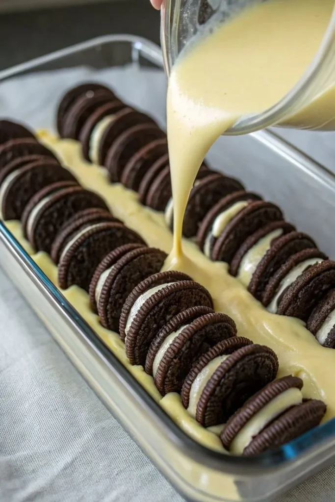 - Layer half of the Oreo cookies in the bottom of the dish.